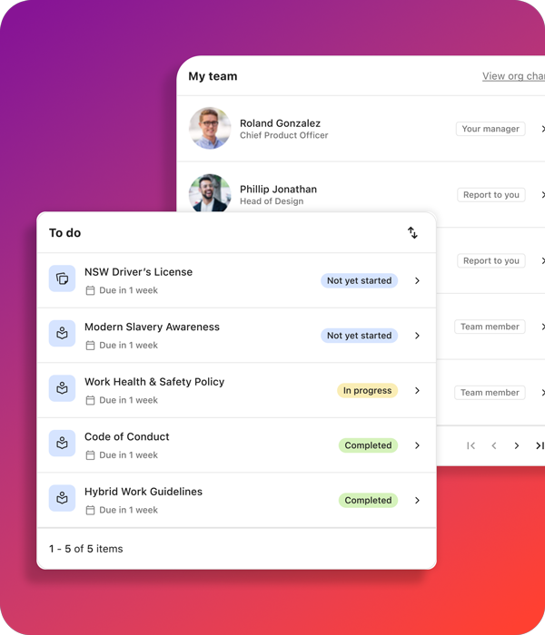 Take the manual work out of onboarding. Assign tasks, documents and approvals automatically based on role, department or location. Track progress in real-time and send reminders to keep things moving.